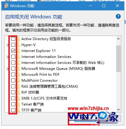 4、选中需要关闭或者开启的功能,关闭某个功能打开复选框把√去掉,开启就把√点上。然后打开确定;